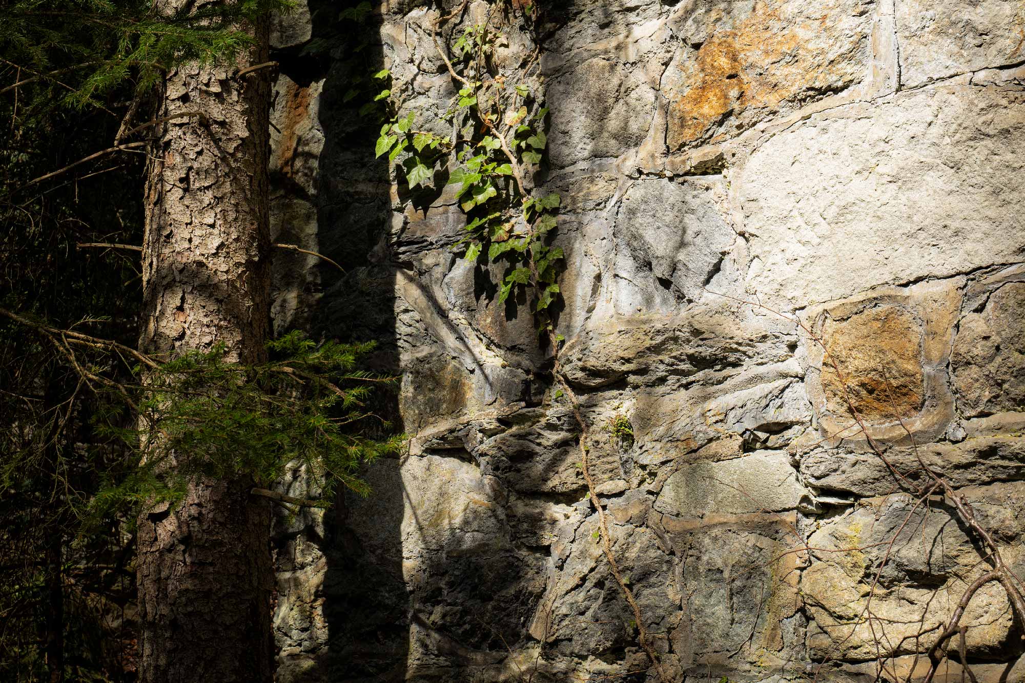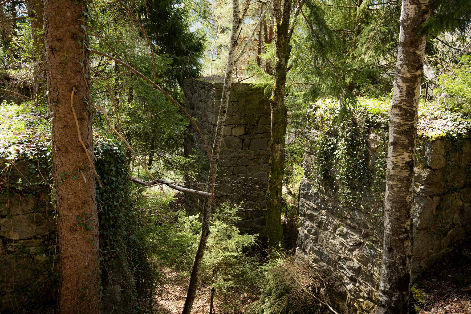 pourrait croire que ce sont des tours carrées toutes de la même taille. Mais ni fenêtres ni portes n’apparaissent, seules ces colonnes de pierre s’élèvent, là, au milieu des arbres. Elles paraissent anciennes car, en leur sein, des arbres ont poussé. D’ailleurs, un jeune sapin sert de couvre-chef à l’une d’entre elles ! Cet endroit est mystérieux et magnifique, les feuilles des arbres créent un jeu d’ombre et lumière sur les parois des piliers mystérieux. La chaleur est douce, et ma frus- tration d’être tombé sur une impasse s’estompe peu à peu.