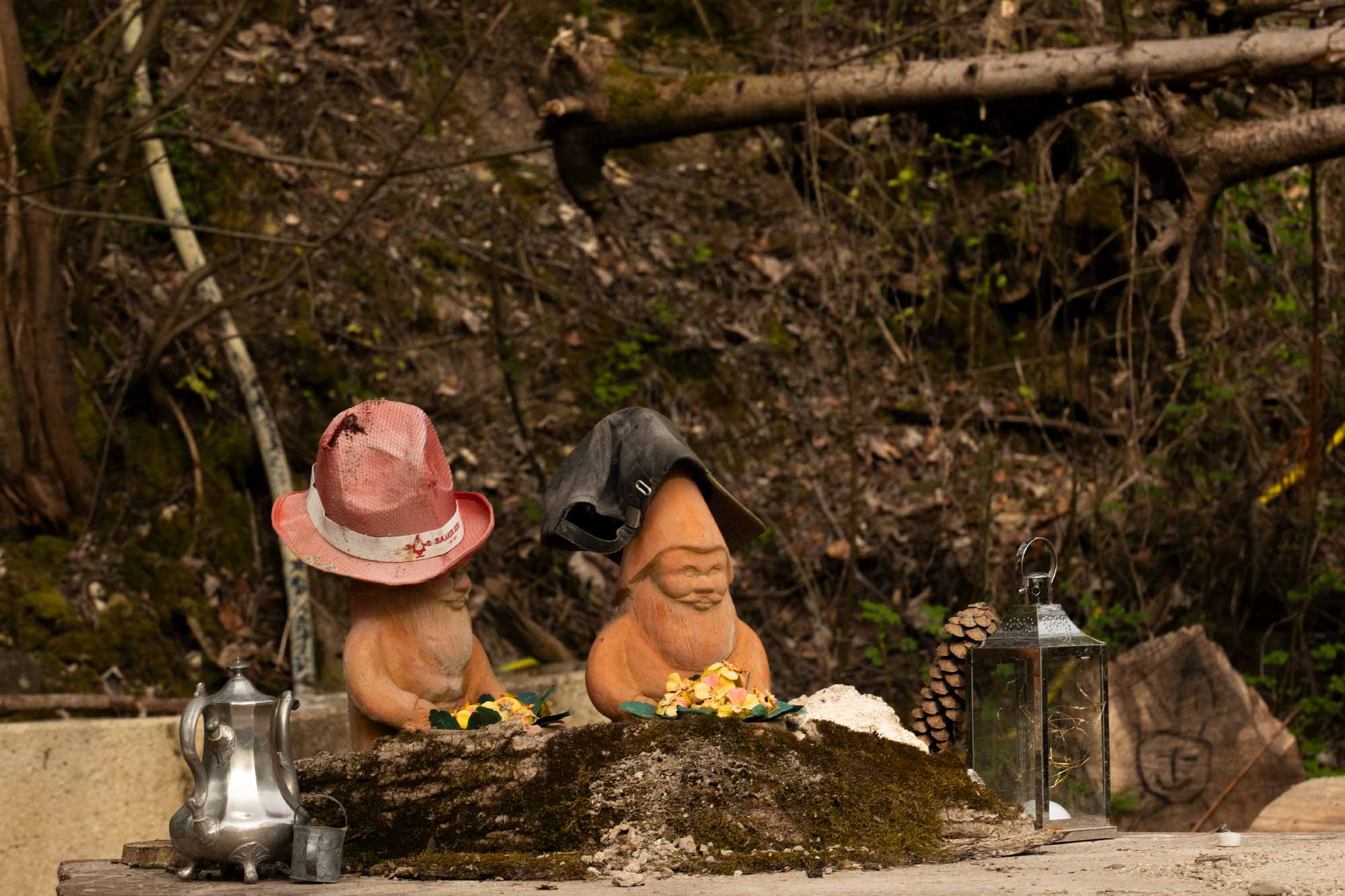 En marchant, je découvre, avec étonnement, deux nains de jardin assis à une table. Pittoresque mais incongru ! J’entends un murmure d’eau qui, doucement, m’appelle. Je dois me baisser afin d’avancer sous de jeunes arbres. J’arrive à un point d’eau qui me fait penser à une piscine de rizière. Un pont étroit me permet de traverser et d’avancer. Au loin, sous des branches basses, appa- raissent des taches de couleur. De tous côtés se dressent des nains de jardin, de grandeurs et de couleurs différentes. Il y en a partout ! L’un d’eux brandit même un panneau « Willkommen ». Etonné et intrigué, je fais le tour du propriétaire. Ce site semble délaissé car des toiles d’araignées, très nombreuses, s’agrippent à ma chevelure. Souriant et joyeux, je pense à cette personne qui s’est construit, elle aussi, un petit patrimoine qui a certainement enchanté ses enfants !