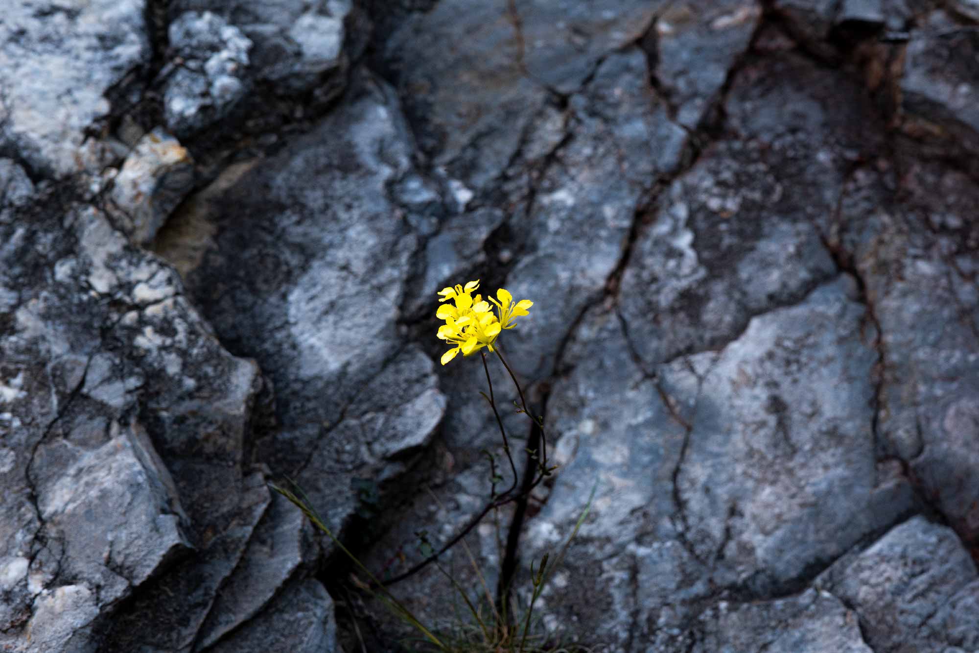 Je pars découvrir la carrière et ses alentours. L’ambiance, ressentie peu avant disparaît. Les plantes et les arbres deviennent rares, les oiseaux ne chantent plus, un grand silence an- goissant s’installe, rompu, parfois, par le bruit d’une pierre qui chute et qui s’écrase froidement sur le sol. L’accès à la carrière est interdit, une barrière empêche l’entrée. De l’autre côté de la grille se trouve une étendue de pierre froide. Quelques rares plantes y ont poussé. A l’écart, un sentier permet de longer une falaise et conduit à la carrière. Là, je découvre quelques éclats de marbre qui compléteront ma collection. Dans cette paroi, une petite fleur a poussé. Combien de temps faudra- t-il pour que la flore revienne dans ce qui a été détruit par l’homme? Combien de temps faudra-t-il pour que la nature se réadapte après notre passage et notre destruction. Mais la nature est forte, elle ré- siste, elle résistera. La roche sera toujours là, permettant aux lichens de s’y accrocher, aux mousses de pousser, aux plantes de se développer.